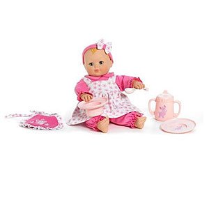 From the renowned doll maker Madame Alexander's line of Sweet Baby Nursery Toys, Baby Cuddles is an adorable baby doll with classic features. This soft, cuddly baby doll comes with eyes that open and close, removable clothing, and a set of baby dishes, so children ages three and up can enjoy feeding and taking care of her. Baby Cuddles Feeding Baby Ages: 3+ What We Think Fun factor: Durability: Educational factor: Novelty factor: The Good: High-quality construction and classic design make for a long-lasting companion. The Challenging: Doll is not meant for immersion in water. In a Nutshell: Classic baby doll with soft and cuddly design, removable clothing and authentic-looking baby dishes. High-Quality, Nostalgic, Yet Cuddly Design Baby Cuddles features a soft cloth body and a head, limbs, hands, and feet made of pliable soft plastic. She is huggable and squeezable, and the softness of her body allows her to bend freely at the arms, legs, and neck. And the fine craftsmanship continues: her fingers and toes are detailed with nails, creases, and dimples, and her face and a few "strands" of hair have the look of a delicately painted ceramic doll. Baby Cuddles also has eyes that open and shut with long eyelashes -- a nostalgic touch on a modern doll. Perfect Playtime Companion Madame Alexander is famous for collectible dolls, but the renowned doll company has designed Baby Cuddles especially for play. In addition to her fine construction, Baby Cuddles comes with removable clothing and realistic baby dishes, including a spoon, sippy cup, plate, and bowl. While many of today's baby dolls feature battery-operated crying or moving, children will enjoy the simplicity of this doll, which leaves all the pretending to their imagination. She can be fed, changed, rocked, and cuddled -- just don't give her a real bath. Because of her cloth body, she isn't meant to be immersed in water, and should only be surface cleaned. What's in the Box Baby Cuddles doll with removable clothing, bib, and toy baby dishes including a spoon, plate, bowl, and sippy cup. This huggable, squeezable doll features a cloth body and soft, pliable plastic head and limbs. View larger. Baby Cuddles comes with toy baby dishes including a spoon, plate, bowl, and sippy cup . View larger. From the gorgeous collection of Madame Alexander dolls comes Baby Cuddles. She has a soft body with sleepy eyes, and a vinyl head, arms and legs. This little bundle of joy comes dressed in a lovely pink outfit, and includes tons of realistic feeding accessories such as a miniature plate, bowl, spoon and sippy cup. Measures 14" long.